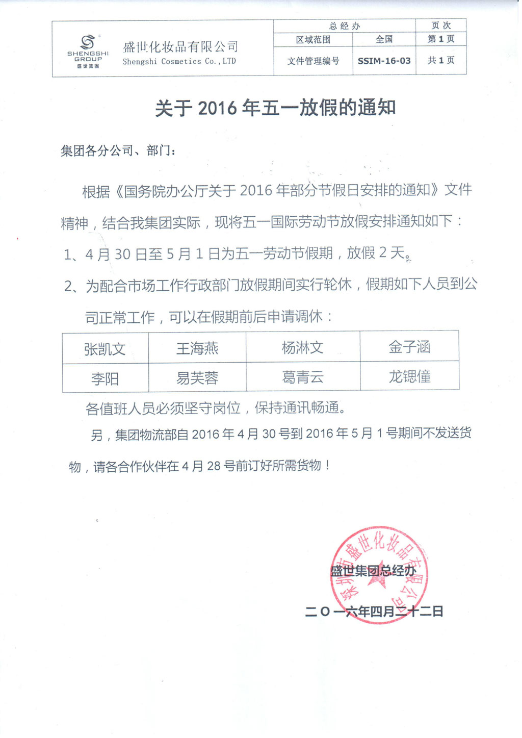 關(guān)于2016年五一放假的通知